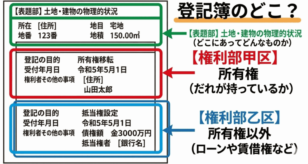 1. 表題部(ひょうだいぶ): 物件の「物理的な状況」が書かれています(所在、面積、構造など)